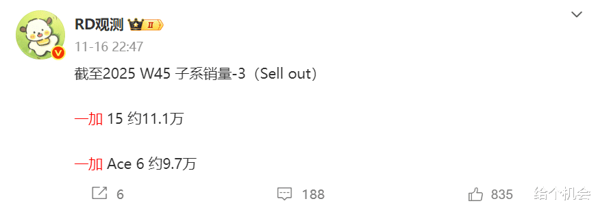 据RD观测统计的数据显示,截至今年第45周,一加ace 6的销量大约9.7万台,这别说对比红米k90、就算是iqoo neo 11晚发布几天,销量也比一加ace 6更多。