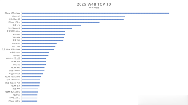 苹果iPhone17系列虽整体仍占据优势——截至11月初,其国内激活量已超825万台,其中ProMax机型占比近一半——但华为的局部突破反映了市场竞争的动态变化。此前,iPhone17系列曾长期包揽周销量前三,而华为Mate80的入榜标志着高端市场格局出现松动。