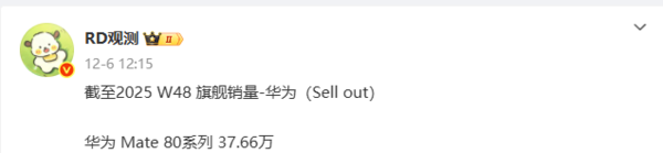 [CNMO科技消息]近期中国高端手机市场出现新变化。根据数码博主“RD观测”公布的数据,截至2025年第48周(11月24日至11月30日),华为Mate80系列销量已达37.66万台,CNMO预计目前总量已达到约40万台的规模。值得注意的是,在该周机型销量排名中,华为Mate80标准版首次超越苹果iPhone17Pro,跻身单周销量前三,打破了iPhone17系列长期垄断榜单的局面。