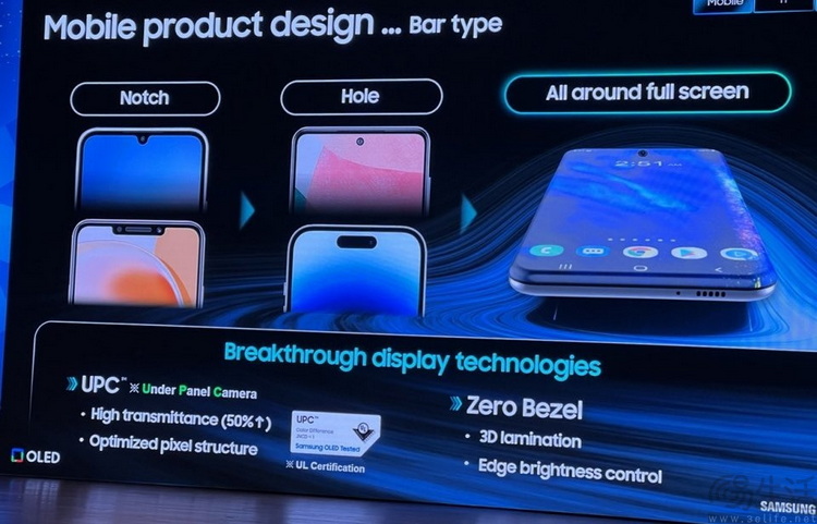 值得一提的是,这种“全曲面无边框”设计其实并非没有先例。因为早在2023年夏季,网络上就曾曝光过疑似来自三星显示的内部资料。其中就已经展示了非常接近相关传言的全曲面无边框屏幕设计,甚至还提到该屏幕可以搭配屏下摄像头使用。