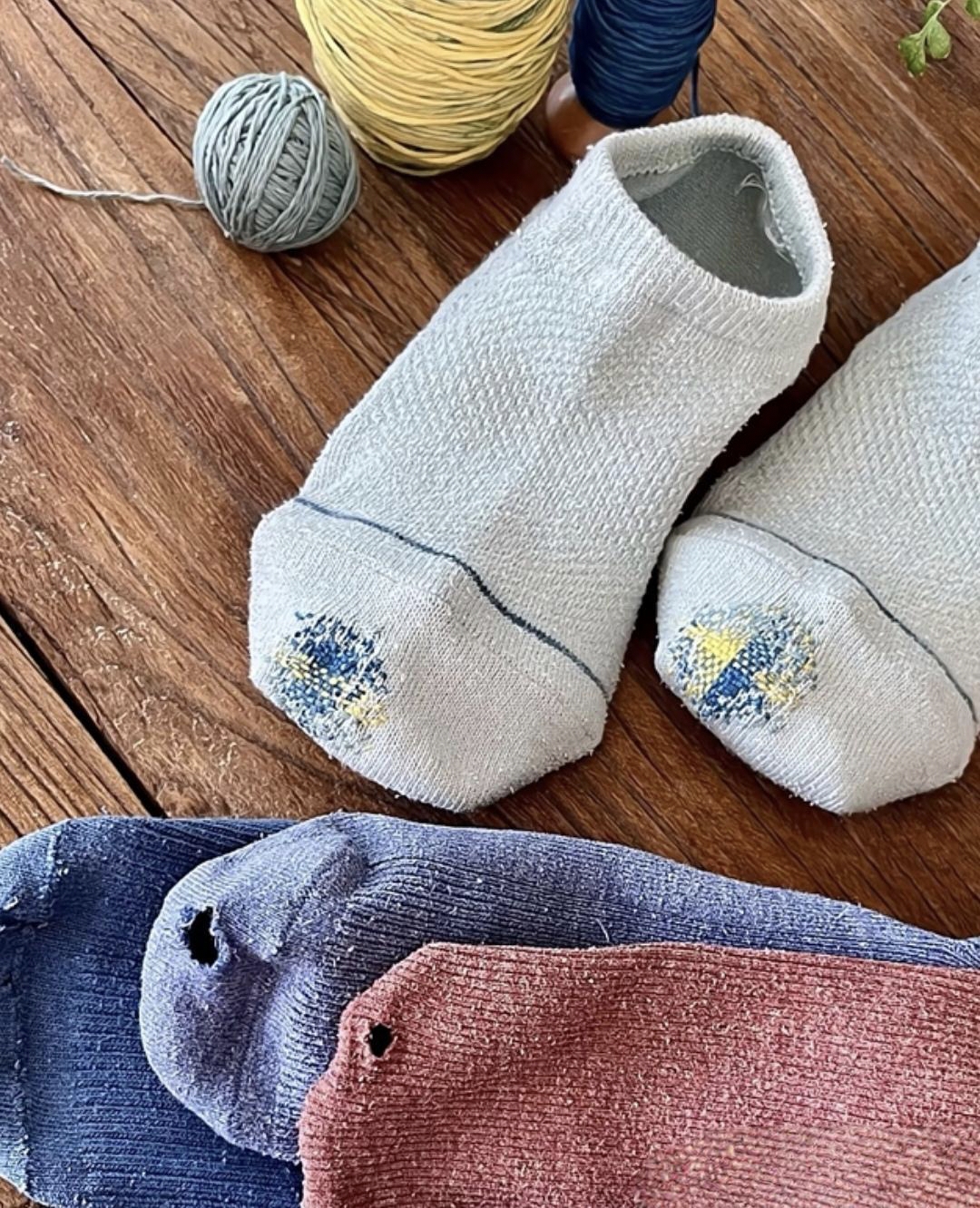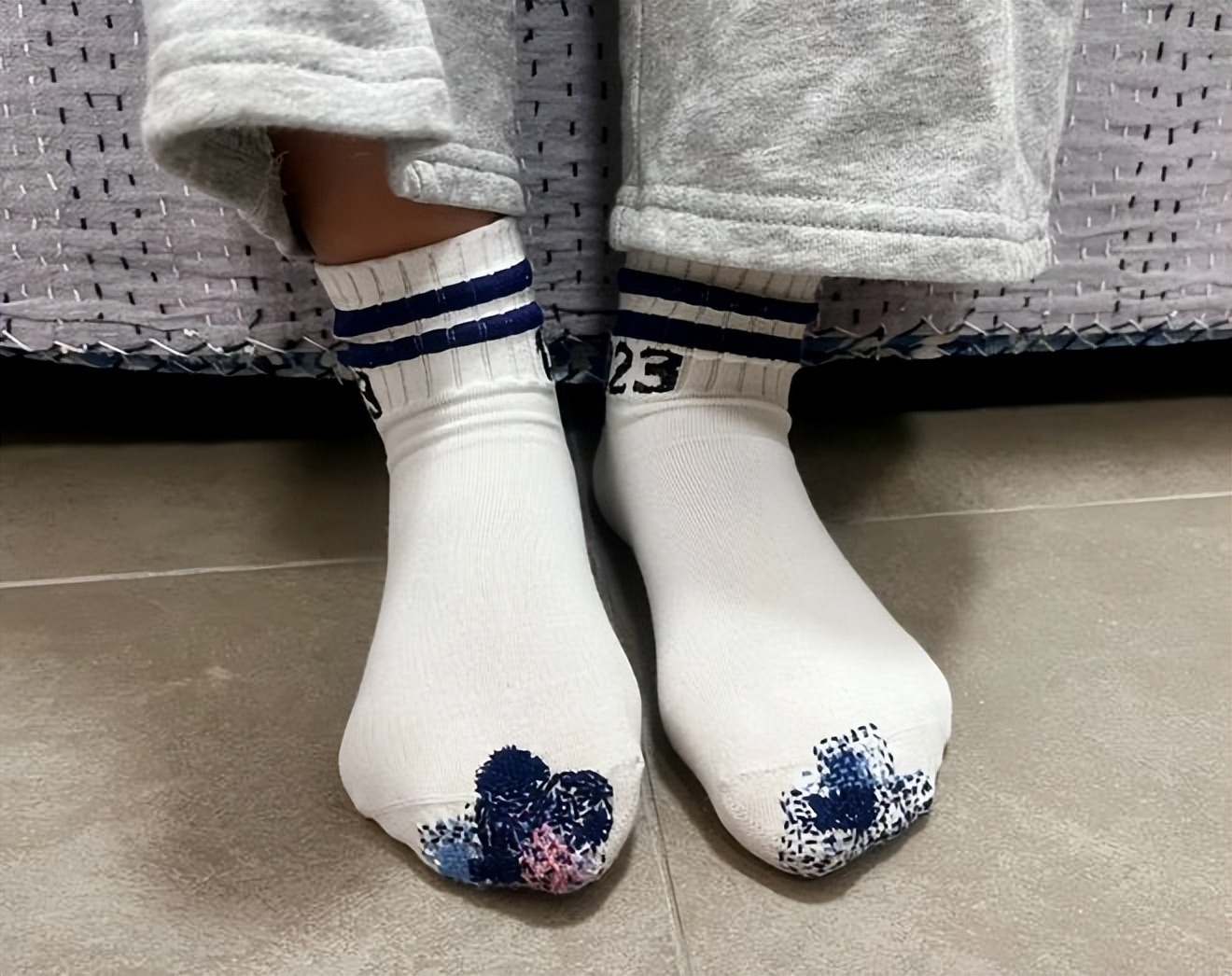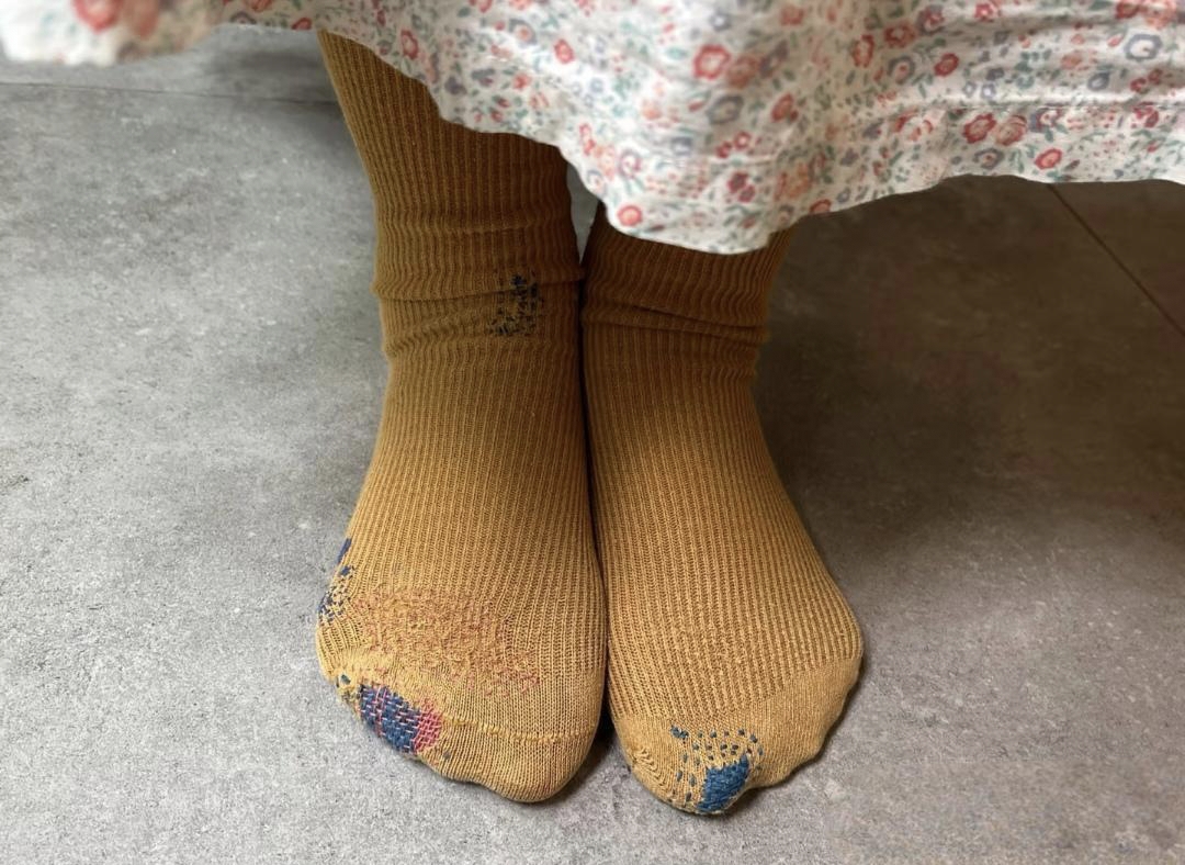 看着手中除了破洞处,其他地方都宛如崭新的袜子,家长想了又想,还是没舍得丢掉,刚好这位家长又比较擅长缝纫,就把这双袜子缝补了起来,用蓝色的针线把破洞处缝补成了花朵的样子。