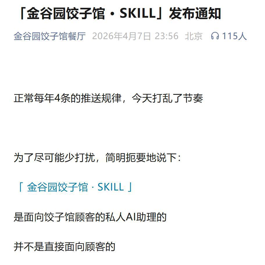 4月7日晚,金谷园饺子馆餐厅在微信公众号发布消息:上线一款AISkill(安装AI技能的指令),顾客通过自己的AI助手可以查询餐厅、店内Wi-Fi、外卖等信息,甚至还可以在线排队。由此,该饺子馆成为全国第一家主动面向Agent(人工智能体)实现排队取号的餐厅。