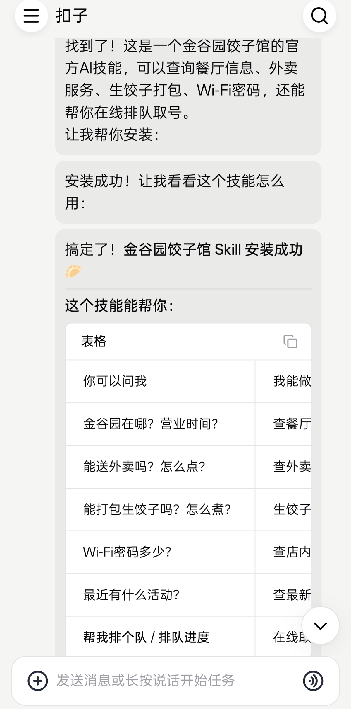 13日下午,记者实测通过Coze输入饺子馆的Skill指令,即可安装AI技能,并对金谷园饺子馆的诸多信息进行查询:在哪吃、几点开门、怎么排队、能不能点外卖、生饺子怎么煮、Wi-Fi密码是什么。
