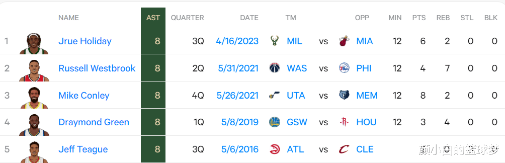 2.NBA历史第二位季后赛首节8助攻的球员,上一位是19年的追梦;