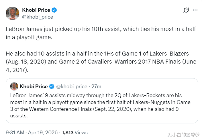 北京时间4月19日,NBA季后赛首轮G1,湖人以107-98击败火箭。这场比赛41岁的勒布朗生涯第293次出战季后赛,他首节就送出8次助攻,半场送出10次助攻,勒布朗努力的态度感染了全队,最终41岁的他拿到19+13+8带队取胜。