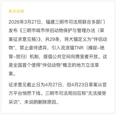 三明这次做的事,其实比之前那些尝试更温和。它不是全国性立法,只是一个地级市的地方管理办法;它没有触碰"禁食狗肉"这条红线,只聚焦城市犬猫的保护与管理。即便如此,20天,就退回来了。