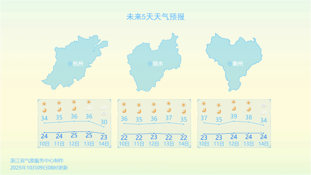 “但今年到了寒露时节,浙江还要发布高温报告,这在以往是不可想象的。”浙江省气候中心高级工程师毛燕军感叹,历史上,浙江最迟高温出现在10月11日,而今年要刷新这个数字。10-13日,我省高温强度和范围再次扩大,愈演愈烈,预计全省大部地区最高气温在35-37℃,浙西南地区局部可达38-39℃。
