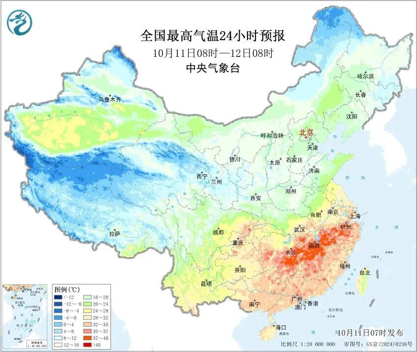 11日至13日,江西、浙江、福建、广东北部和东部、广西北部、湖南东部和南部等地有35℃以上高温天气,其中,江西、浙江中西部等地部分地区最高气温可达38℃以上。