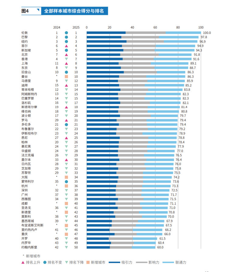 在本轮评估中,综合排名前10的城市依次为:伦敦、巴黎、纽约、首尔、新加坡、北京、香港、上海、东京、旧金山和曼谷,其中旧金山和曼谷并列第10名。