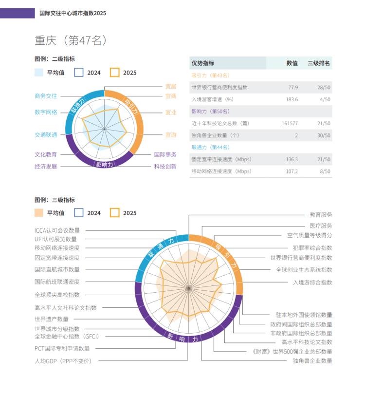 在报告中的城市画像中,将上榜城市在吸引力、影响力、联通力等优势指标都进行了量化。其中重庆吸引力(第43名),包含世界银行银行便利度指数77.9,入境游客增速183.6%;影响力(第50名),包括近十年科技论文总数(篇)161577,独角兽企业数量(个)数值2;联通力(第44名),包括固定宽带连接速度(Mbps)数值136.3,移动网络连接速度(Mbps)数值为107.2。