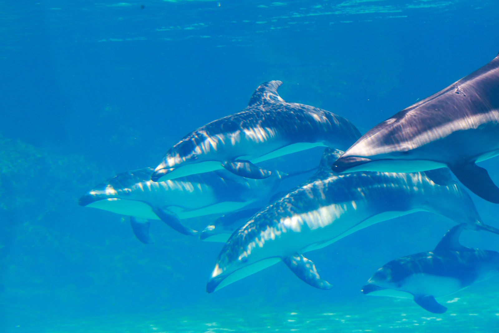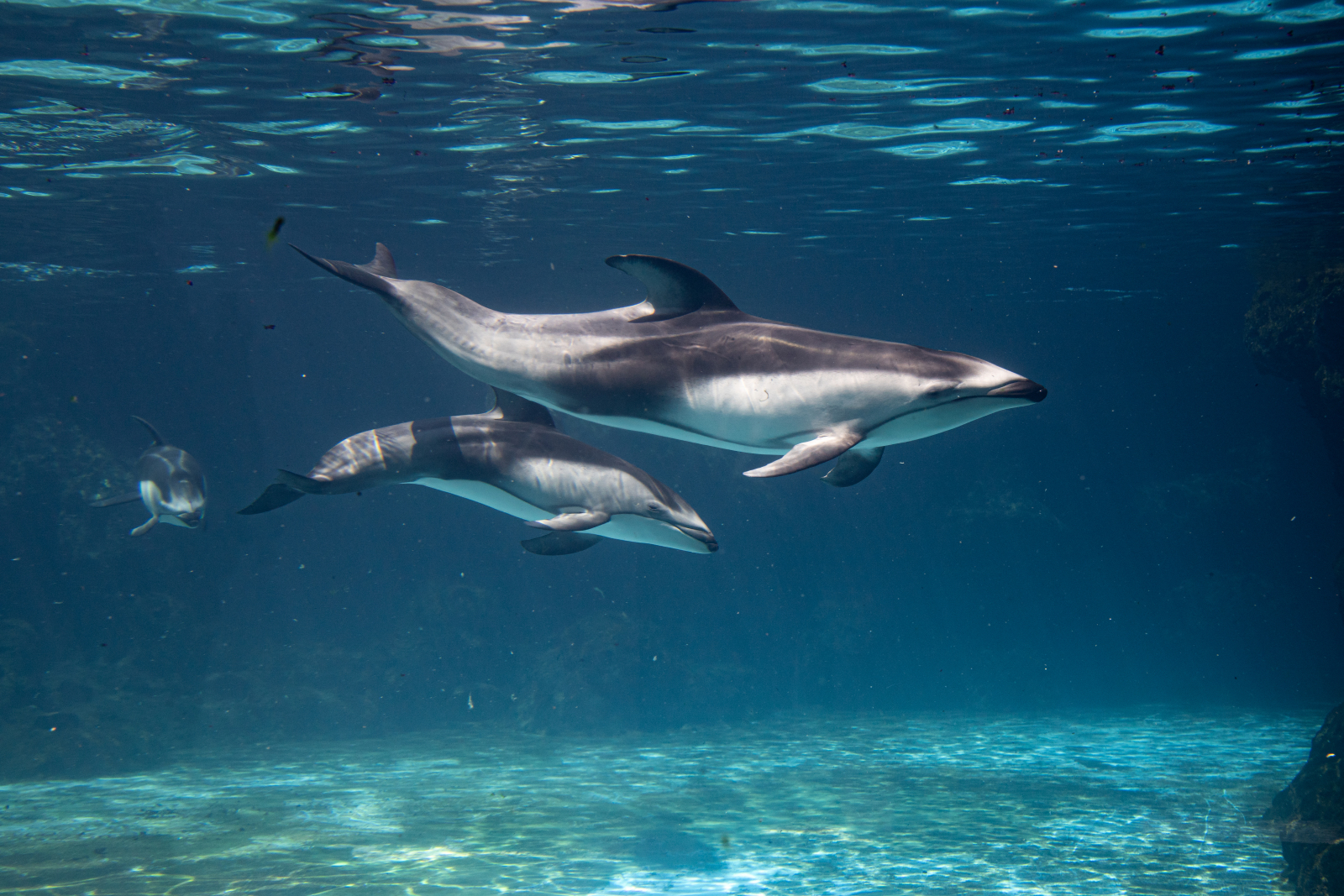 太平洋短吻海豚俗称“太平洋白边海豚”,体背呈黑灰色,腹部为白色,体型较其他海豚偏小,但动作灵敏、游速快,性格外向。保育员徐忠祥表示,这几头海豚宝宝格外活泼,喜爱玩耍,游客常可欣赏到它们追随母亲跃出水面的精彩画面。