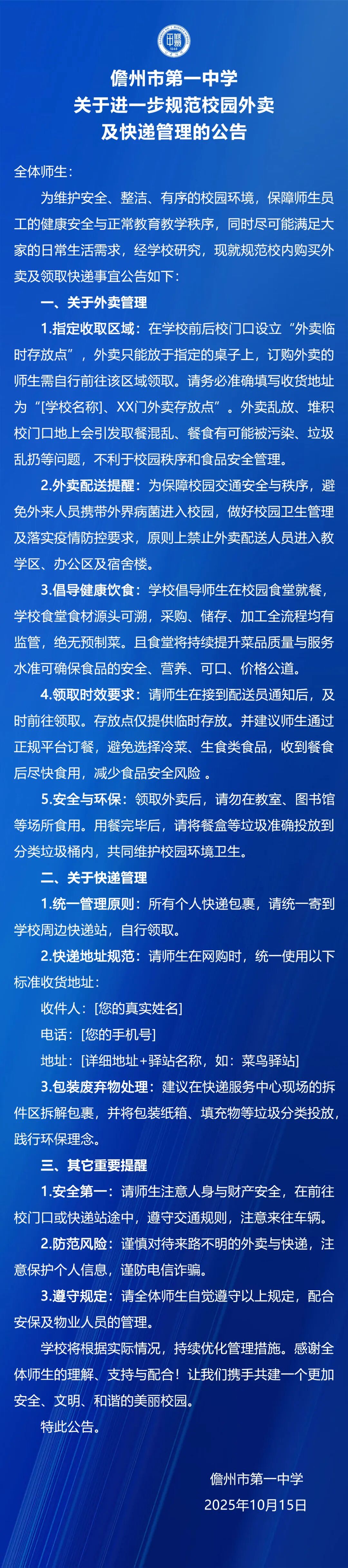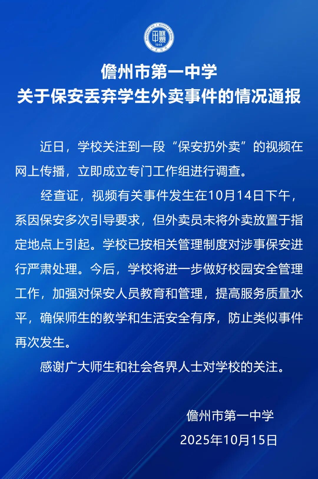 海南儋州一中通报“保安丢弃学生外卖”:因外卖员未将外卖放置指定地点引起 作者: • 更新时间:2025-10-16 21:22 • 海南儋州一中发布关于保安丢弃学生外卖事件的情况通报: 本文内容由互联网用户自发贡献,该文观点仅代表作者本人。如发现本站有涉嫌抄袭侵权/违法违规的内容,请发送邮件至 203304862@qq.com 本文链接:https://jinnalai.com/jingyan/783011.html
