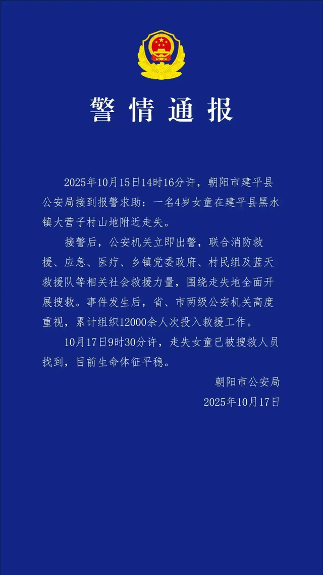 随后,辽宁朝阳市公安局发布通报:2025年10月15日14时16分许,朝阳市建平县公安局接到报警求助:一名4岁女童在建平县黑水镇大营子村山地附近走失。