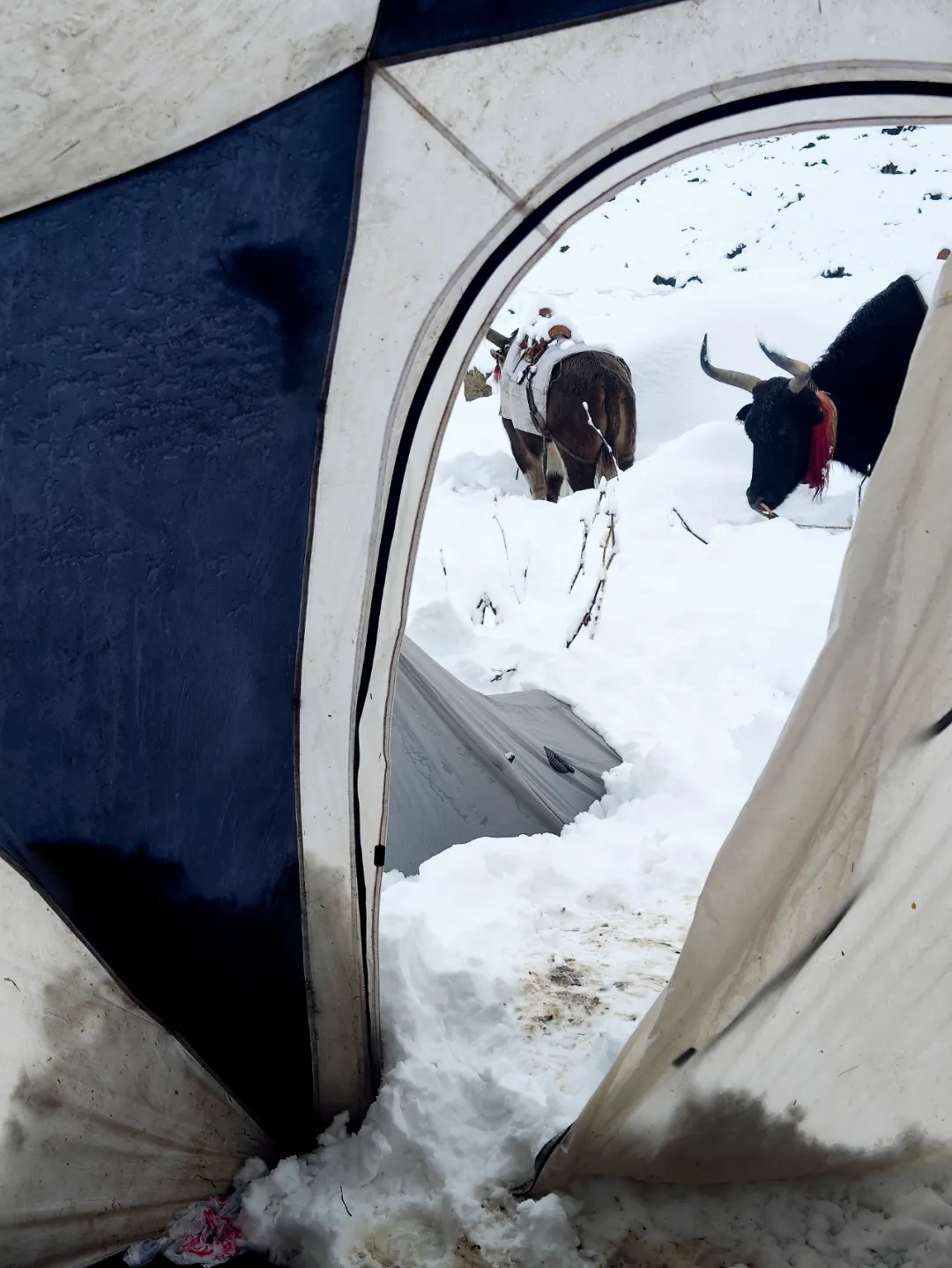10月5日,珠峰东坡,暴雪后帐篷外的牦牛。图/受访者提供