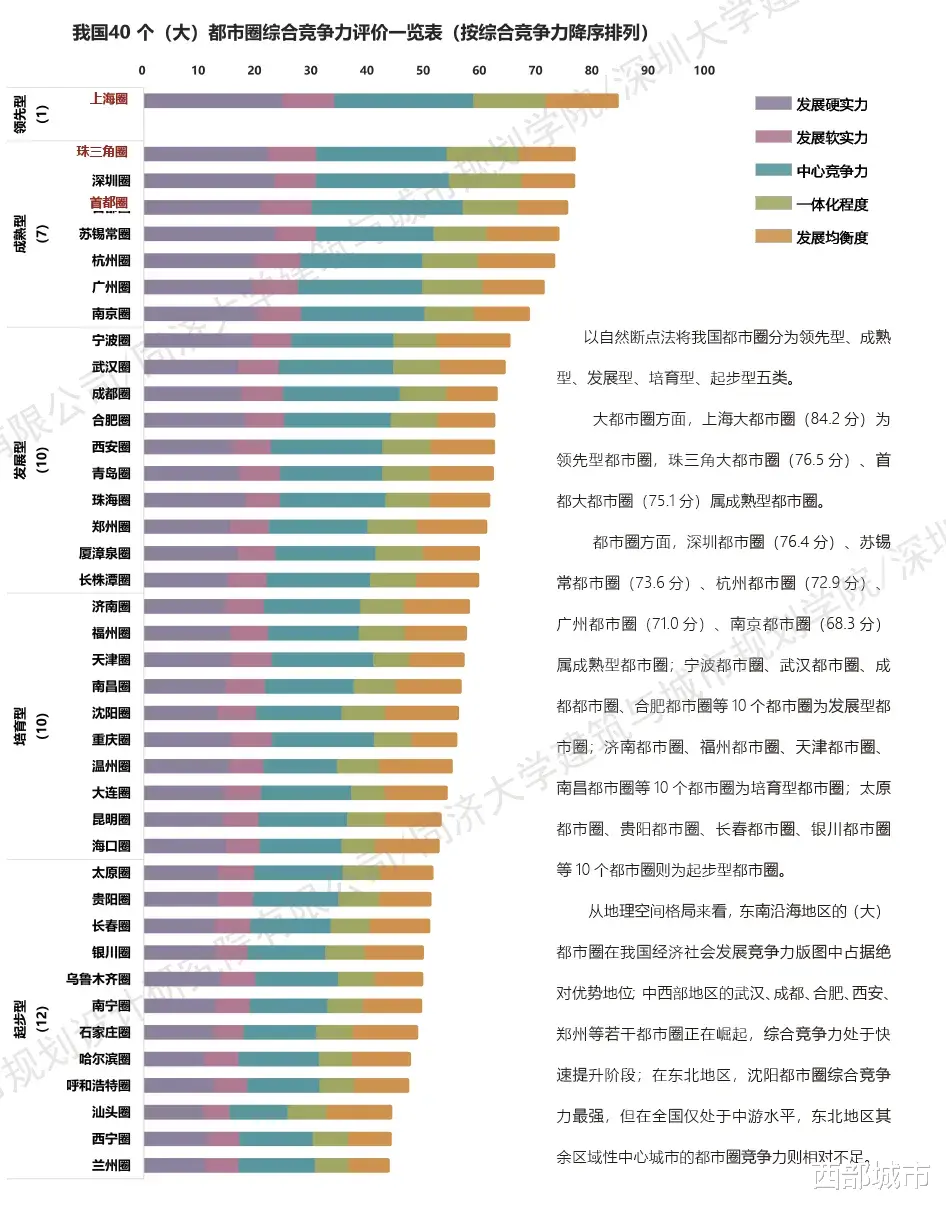居于第二档的“成熟型”都市圈,也只有珠三角、首都2个大都市圈,以及深圳、苏锡常、杭州、广州、南京5个都市圈。