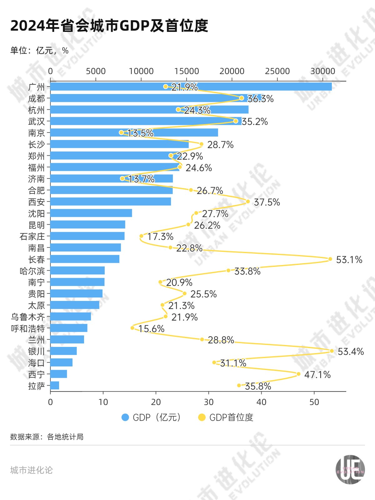 省会首位度,即省会城市GDP占所在省份GDP的比重,是衡量省会能级的重要指标。