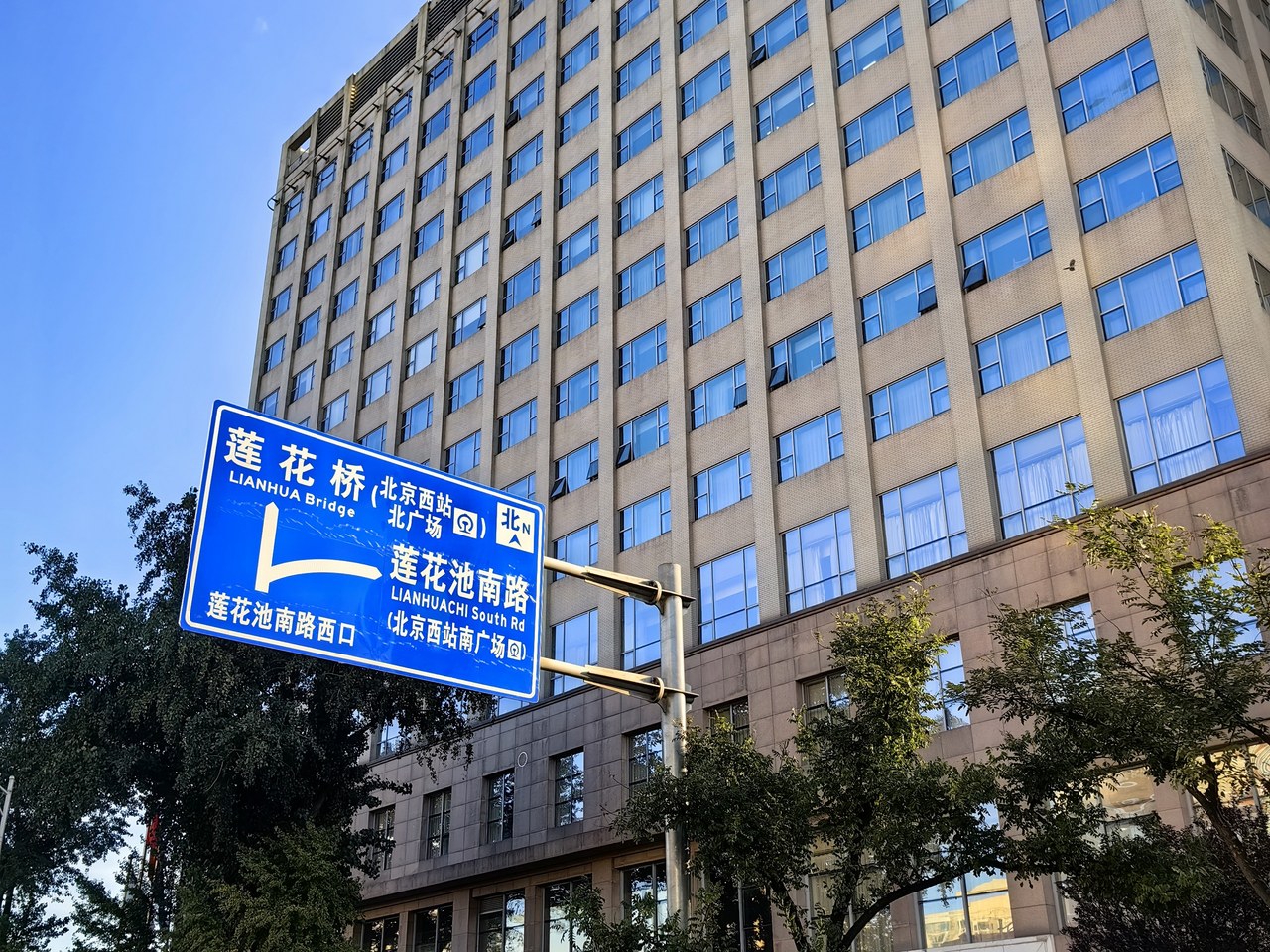 一个人开车时,路牌太小,自己视力不好,怕看不清楚,我就开始记旁边的建筑物。经过中尼文化交流中心和六里桥后,看见通用健康大厦,继续行走几百米,在中国安能大厦附近,就可以进入辅路。