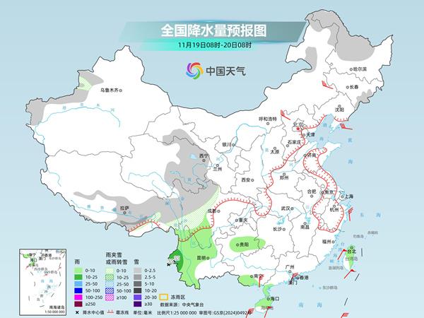 中央气象台预计,今天,新疆南疆盆地、西藏北部和东部、青海南部和西部、甘肃河西、川西高原北部等地部分地区有小雪或雨夹雪。西南地区东部和南部、华南大部、台湾岛等地部分地区有小到中雨,其中,云南西南部、台湾岛北部等地部分地区有大雨。