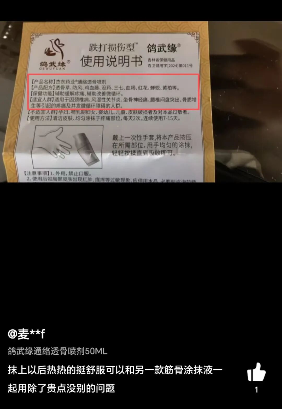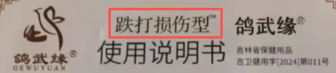 还有网友发布视频指出,“通络透骨喷剂”的产品批准文号为“吉卫健用字”,属于保健用品,依法不得宣传治疗功效。但该产品包装上印有“跌打损伤型”字样,并在右上角标注了并不显眼的“TM”商标符号。这种表述可能会被消费者理解为产品功效的直接标识。