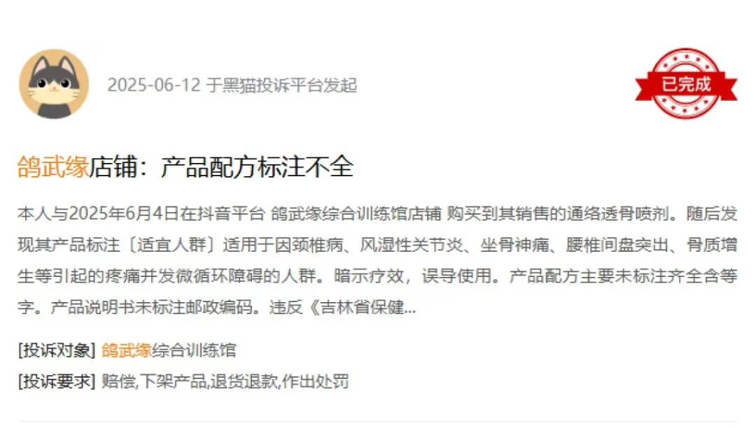 但在近日,科普博主“成分宝-宝哥的成分检测”发布视频指出,其售卖的一款膏贴含有辣椒素等多种未在配料表中明确标注的成分,引发对产品安全性的担忧。同时,“鸽武缘”另一款喷剂产品也因产品说明书涉嫌违规宣传,要求退款。