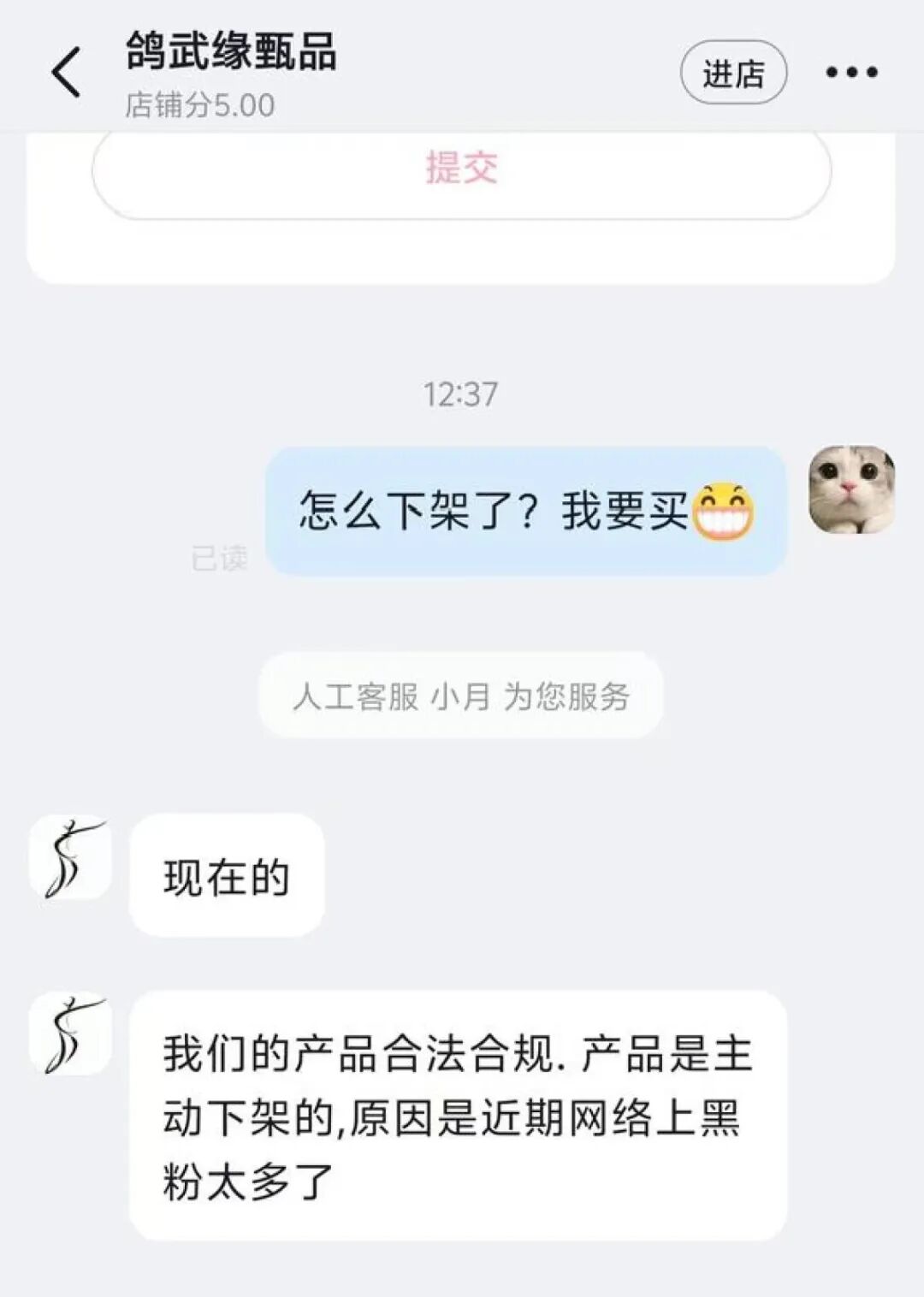有网友就下架原因询问“鸽武缘”橱窗客服并截图,客服表示,产品下架并非因质量问题,“我们的产品合法合规,产品是主动下架的,原因是近期网络上黑粉太多了”。