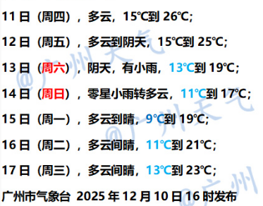 广州市气象台预计,12月11日—12日广州天气总体平稳,以多云为主,局部有零星小雨,最低气温15℃左右,最高气温25~26℃。12月13日起受中等偏强冷空气和南支槽影响,广州小雨转多云,最高气温下降至17℃左右,最低气温下降至9℃左右,陆地阵风加大至6~7级,港区和高地阵风7~9级。