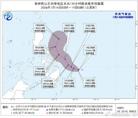 据中央气象台消息,菲律宾以东热带扰动已于今天(1月14日)上午加强为热带低压,8点钟其中心位于菲律宾马尼拉东偏南方向约1240公里,就是北纬9.4度、东经131.1度,中心附近最大风力有7级(15米/秒),中心最低气压为1002百帕。预计,该低压将在原地回旋少动,未来向西北转东北方向移动,强度逐渐加强,可能于未来24小时内加强为今年第1号台风,最强可达热带风暴级(18-23米/秒,8-9级)。