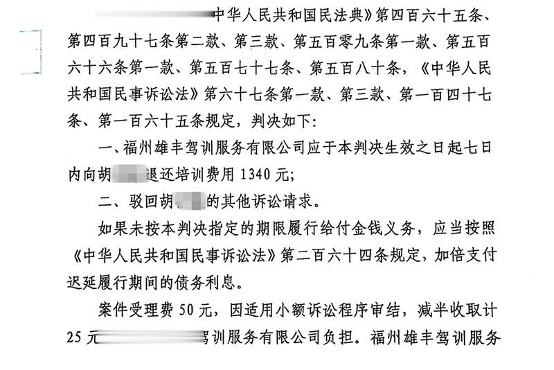 “我正在申请强制执行,让驾校退费。”学员胡小梅告诉记者,她缴费三年一直没空培训,去年7月向福州雄丰驾训服务有限公司(以下简称“雄丰驾校”)申请退费,驾校以“合同过期”为由拒绝。同年11月,法院判决驾校退还1340元,但这笔钱至今未到账。雄丰驾校负责人郑先生坚持“胡小梅要先注销考籍,不占用驾校建档名额后才能退钱”。