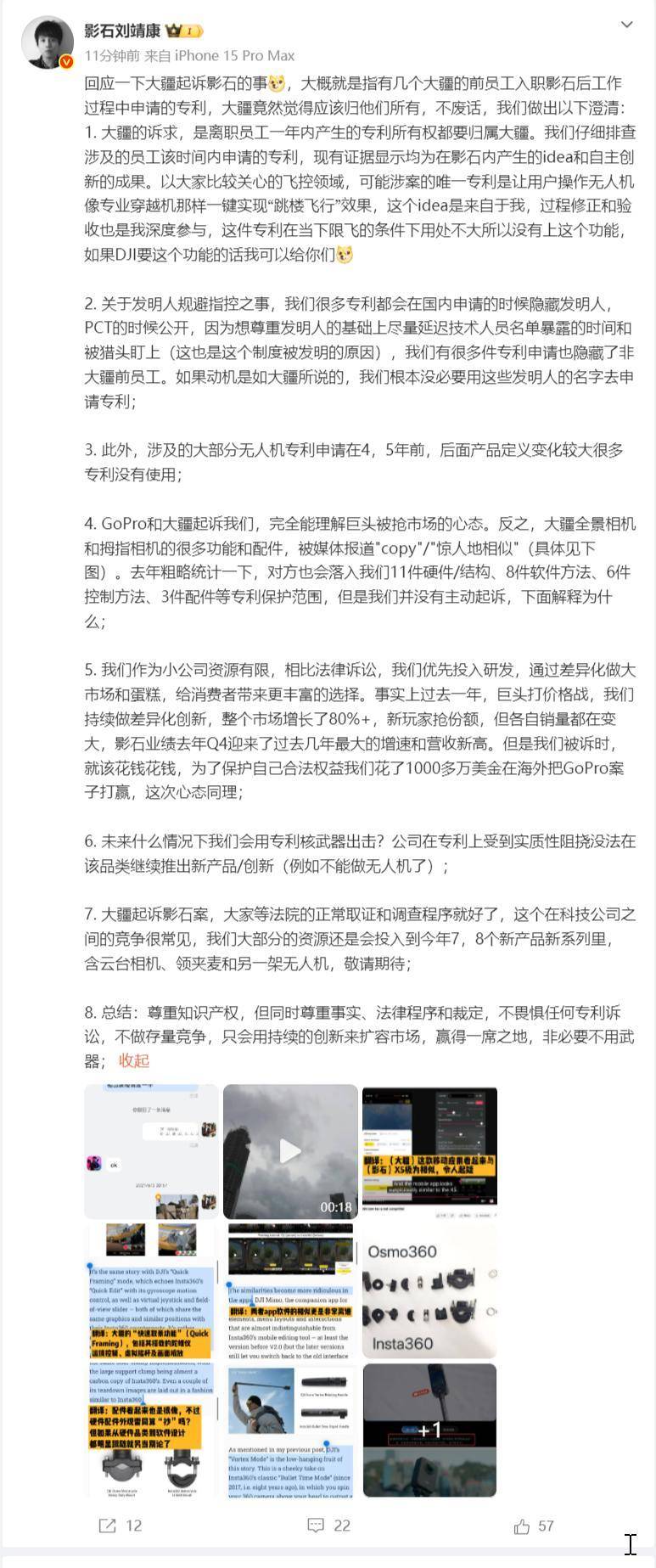 此外,影石创始人兼CEO刘靖康也在微博上作出更直接的回应:飞控领域可能涉案的唯一专利,创意来源于他本人,且该功能(一键“跳楼飞行”)在当下限飞条件下用处不大,“如果DJI要这个功能的话我可以给你们”。同时,他直言“GoPro和大疆起诉我们,完全能理解巨头被抢市场的心态”,并暗指大疆多款产品“复制”影石的创新功能与设计。