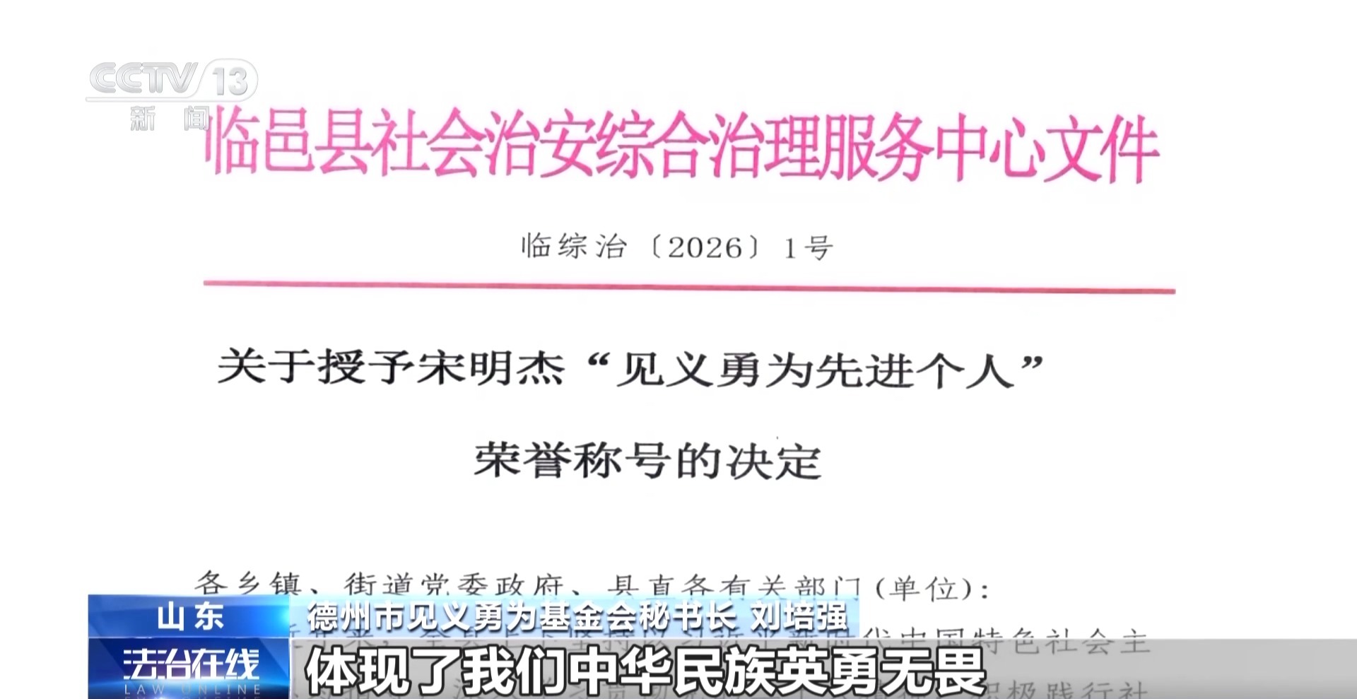 德州市见义勇为基金会秘书长刘培强:宋明杰英勇救人的行为体现了中华民族英勇无畏、舍己为人、崇德向善的见义勇为精神。2月14日,经相关认定程序后,确认宋明杰救人行为属于见义勇为。