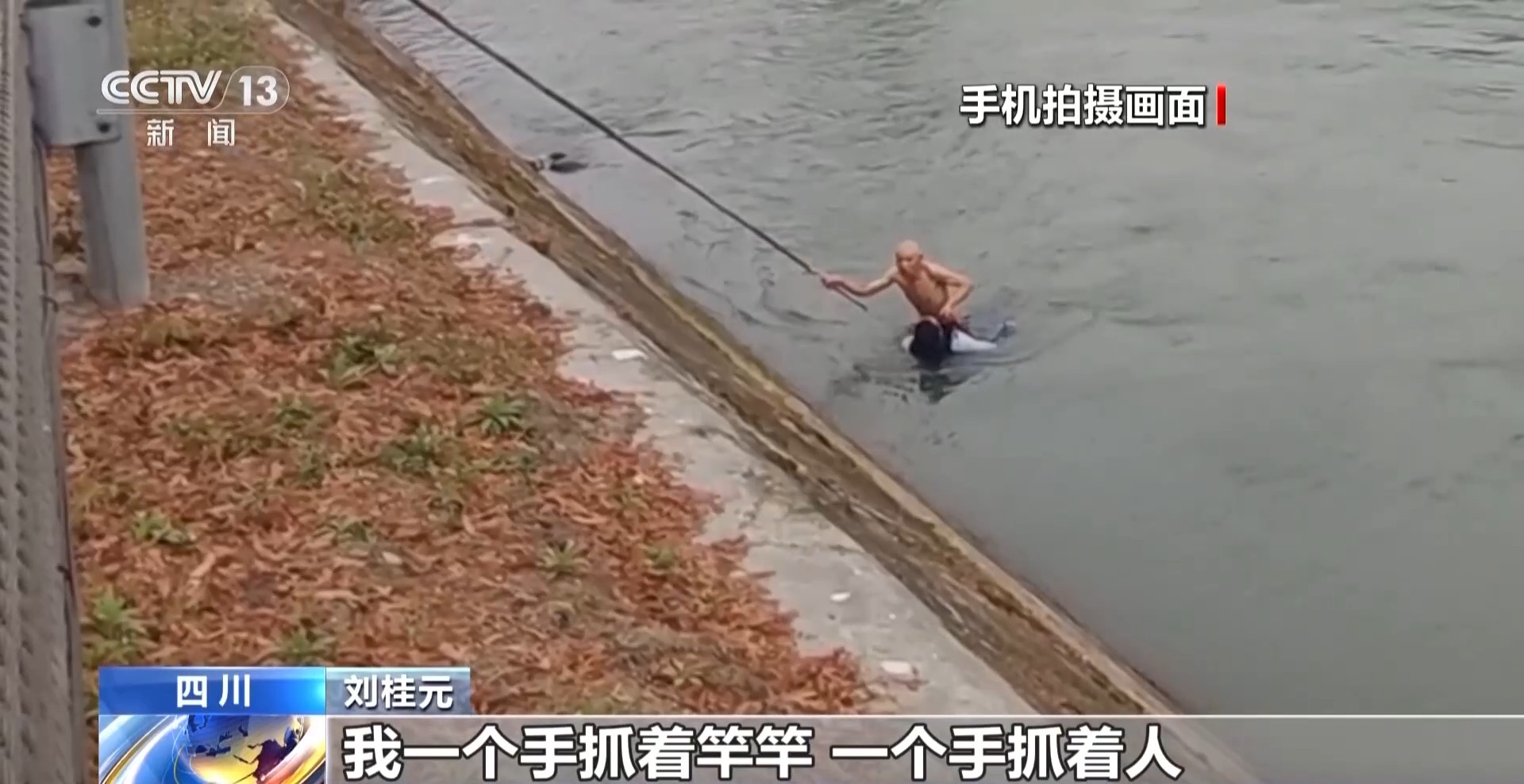 刘桂元:我一只手抓着竹竿,一只手抓着人,那水里面有石头,石头底下又有青苔,是滑的,就站不稳,连摔了四五下,脚现在还没好。