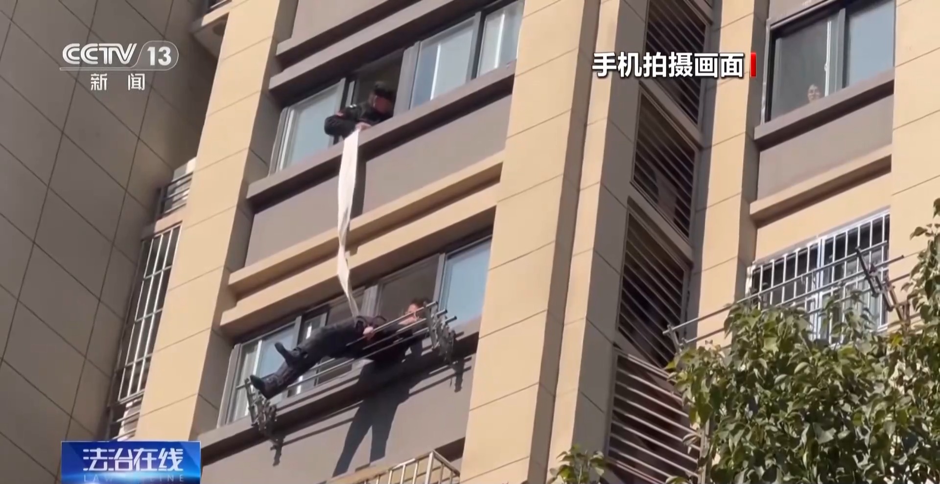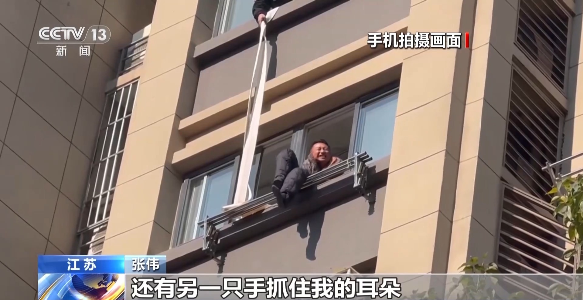 张伟:老人家当时也在喊撑不住了,我就把两头全部系在我的腰上,做两重双保险,让两个保安员和一个在家的业主,三个人拉着我,缓缓下坠。因为我自身也是退伍军人,也经常锻炼,对自己也有一定的把握。