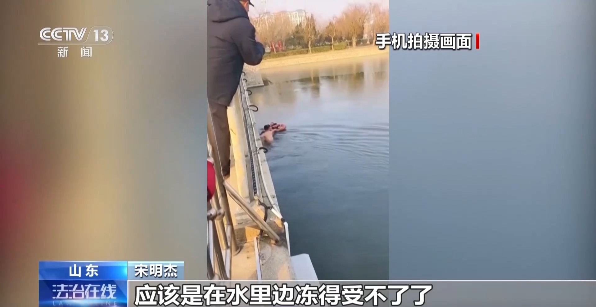宋明杰:当时在桥西边的位置,听见东边有人喊救命,赶忙跑过来,发现落水的大哥就在桥的正中心,当时天气比较冷,他穿的衣服比较多,大哥处于一个漂浮在水面上的状态,一直喊救命,应该是在水里冻得受不了了。