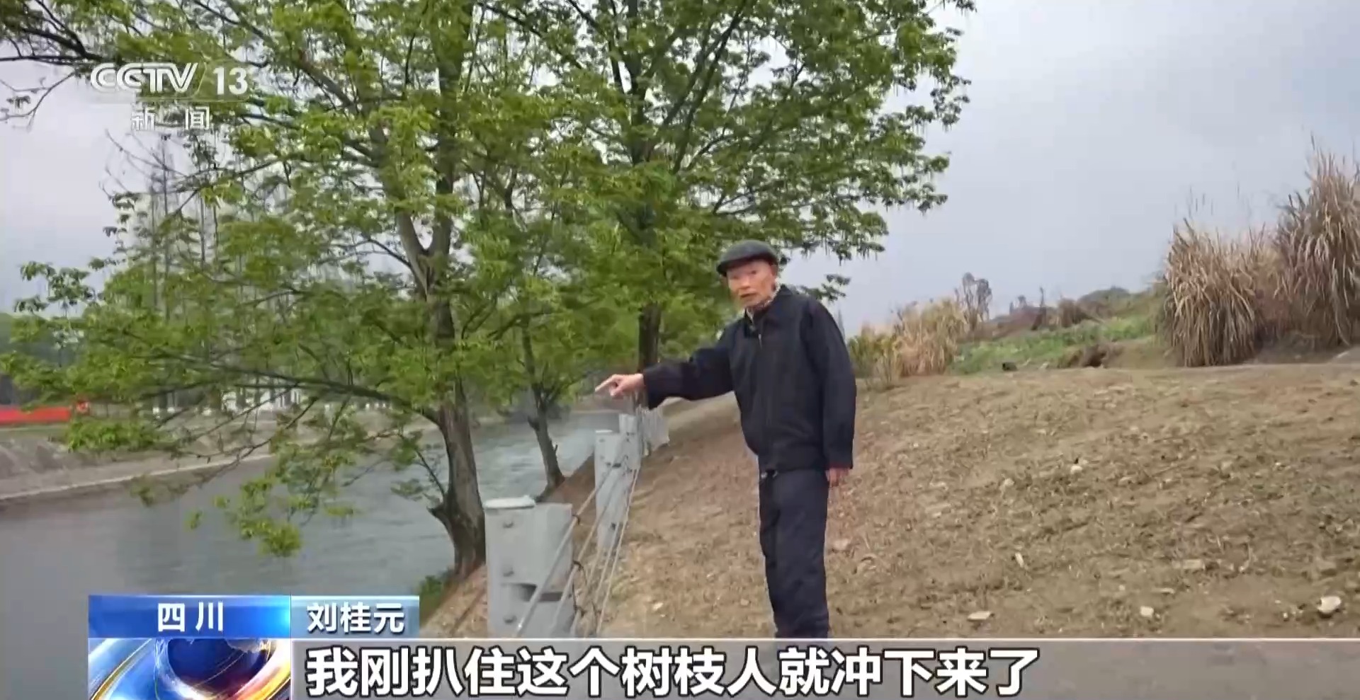 刘桂元:就想着赶紧去救人,把车子丢在地上,然后走到这个位置,开始脱衣裳,刚跑到树这里,那个人就冲下来了,我“咚”一声跳下去了。