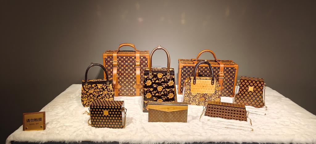 图为荣获第十七届中国民间文艺山花奖的骨木镶嵌箱包系列(一组9件)。新华社记者余俊杰摄