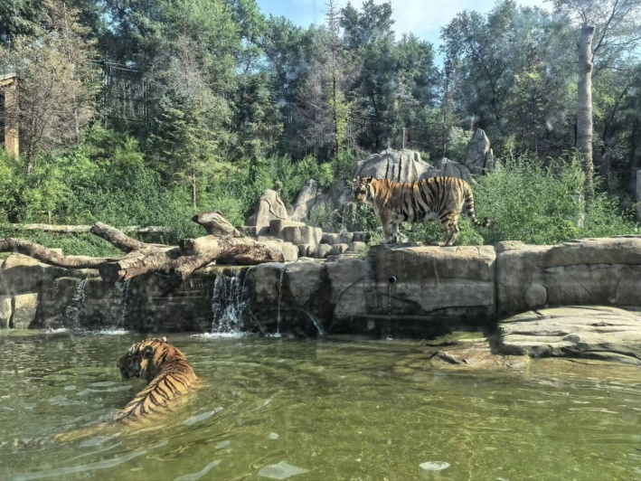 饲养在相应水域花园内的东北虎,有护栏和玻璃等防护。
