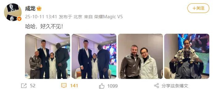 10月11日,成龙晒出多张与贝克汉姆、姚明、奥尼尔的合影,并配文:哈哈,好久不见!