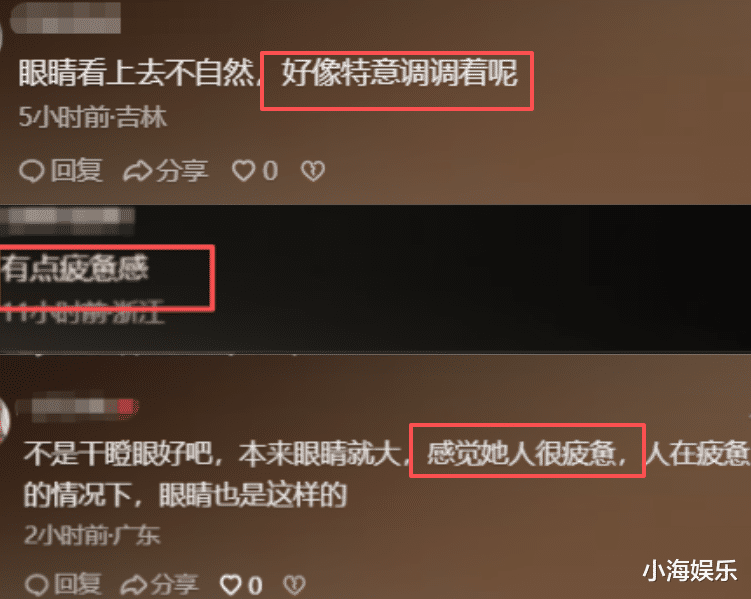 杨颖在整个过程中,都像是极力瞪大眼睛,但就是看起来就是没有神,十分空洞不自然。也有网友认为,也有网友认为是因为她太疲惫了,眼睛本来就大,人在很疲惫的时候眼睛就是这样的。
