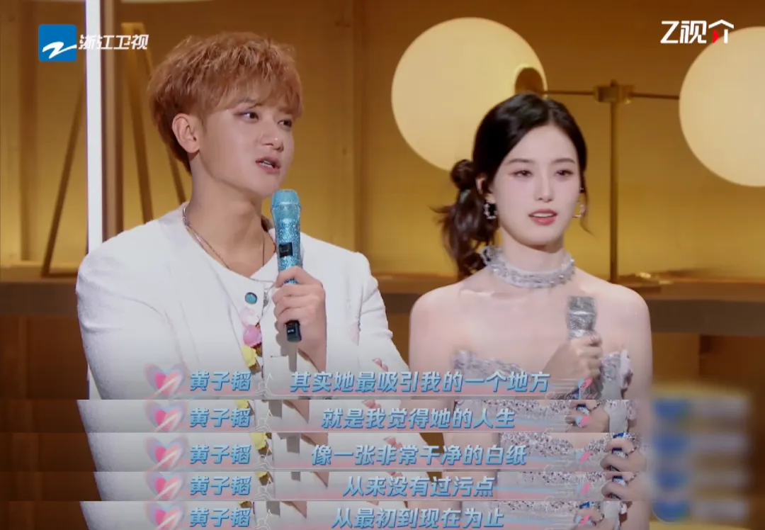 不久前,在热播综艺《天声一对》中,当被问及“徐艺洋最吸引你的特质”时,黄子韬大方示爱:“其实她最吸引我的一个地方,从最初到现在为止,就是我觉得她的人生像一张非常干净的白纸,从来没有过污点。”