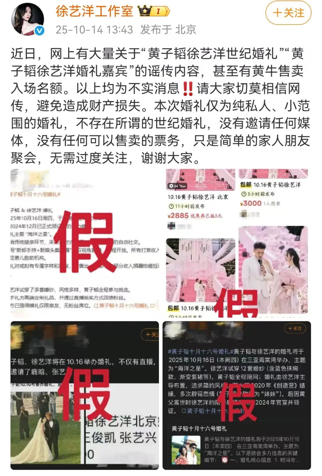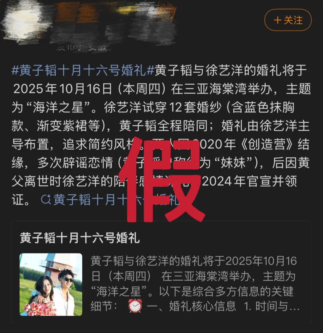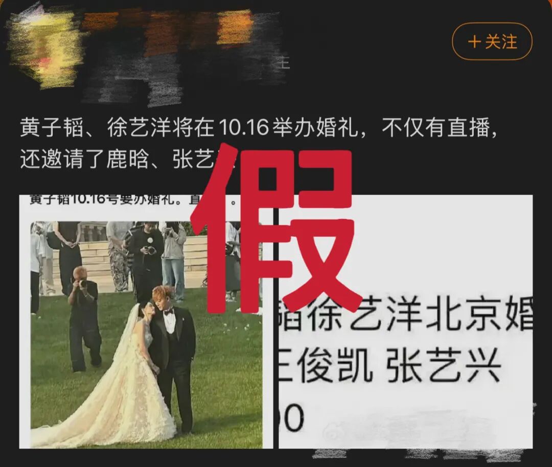 近日,网上有大量关于“黄子韬徐艺洋世纪婚礼”“黄子韬徐艺洋婚礼嘉宾”的谣传内容,甚至有黄牛售卖入场名额。