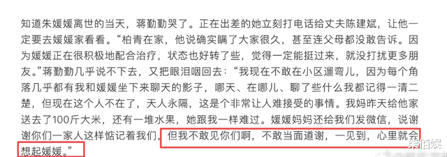 朱媛媛去世以后,外界一直都很关注她家人状况。早前与朱媛媛同住一小区还是好友的蒋勤勤受访时透露称朱媛媛父母还在北京,但不愿出门,因为怕看到那些熟悉的人和事想到女儿。