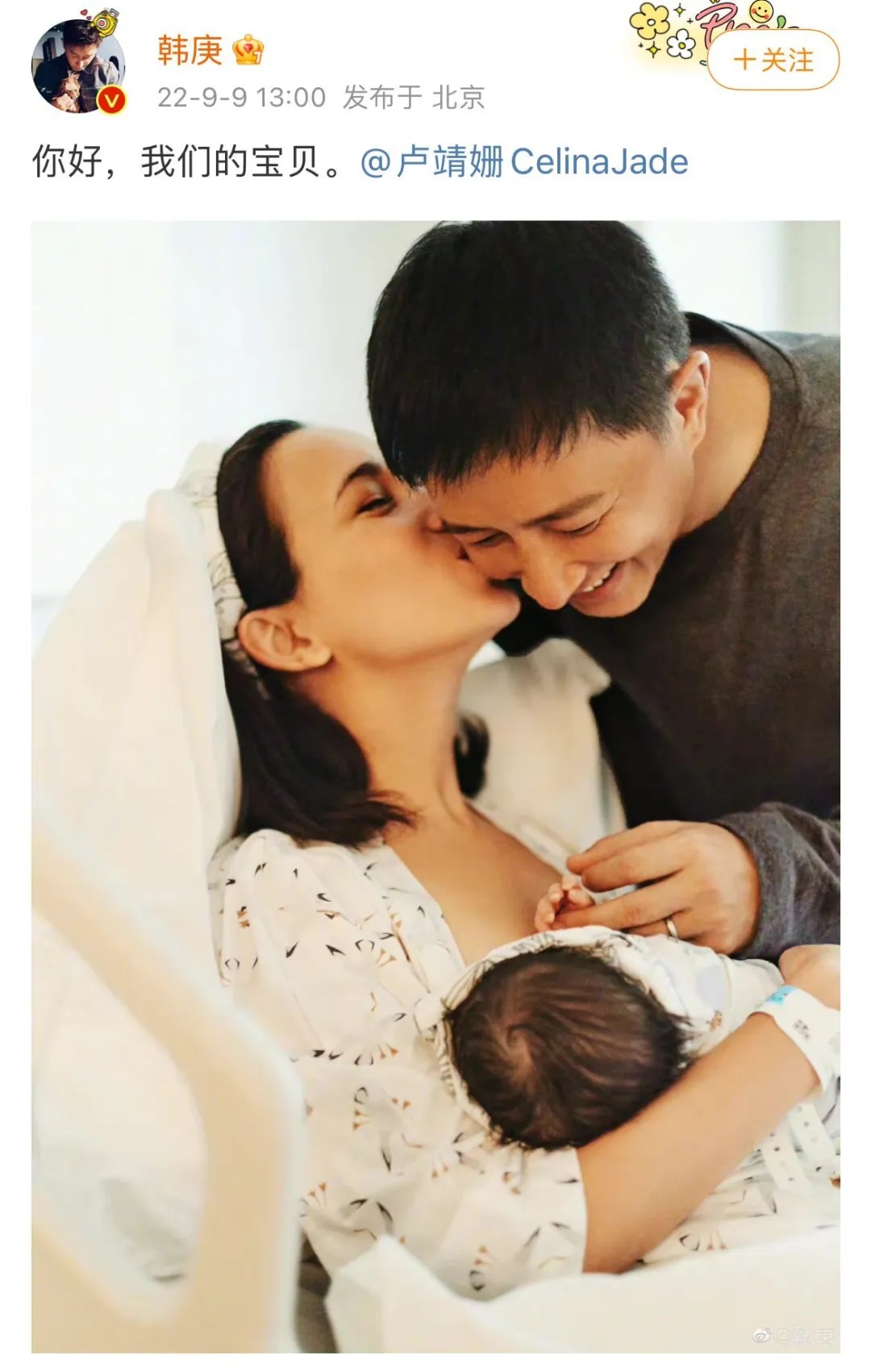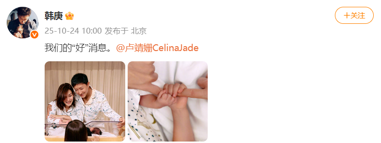 据看看新闻Knews:10月24日,韩庚、卢靖姗夫妇在个人社媒同步晒出一家四口合照、牵手照,并配文:“我们的‘好’消息”,官宣二胎出生。