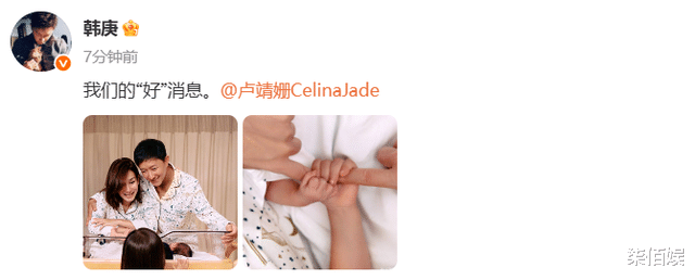 10月24日,韩庚卢靖姗一起发文官宣好消息,幸福分享二胎宝宝出生喜讯。