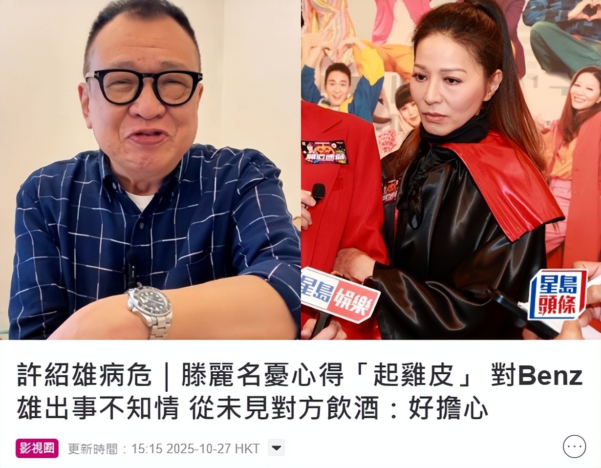 滕丽名坦言得知许绍雄入院非常担心,他是一位很好的前辈,玩得来又大方,很照顾后辈,并不知道他出事了,平时很健康很开朗,而且从未见过许绍雄喝酒,还经常看到他带女儿做运动,私下很少联系,但在工作碰面时会相互问候。
