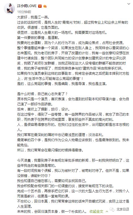 江一燕随后发文致歉,称自己会积极配合相关部门的一切调查约谈,接受所有规范下的决定。