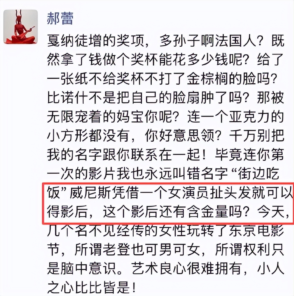 有网友曝料郝蕾在朋友圈内涵辛芷蕾,声称:“威尼斯凭借一个女演员扯头发就可以得影后,这个影后还有含金量吗?”