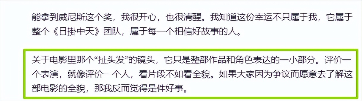 她表示:“关于电影里那个‘扯头发’的镜头,它只是整部作品和角色表达的一小部分。评价一个表演,就像评价一个人,看片段不如看全貌。如果大家因为争议而愿意去了解这部电影的全貌,那我反而觉得是件好事。”