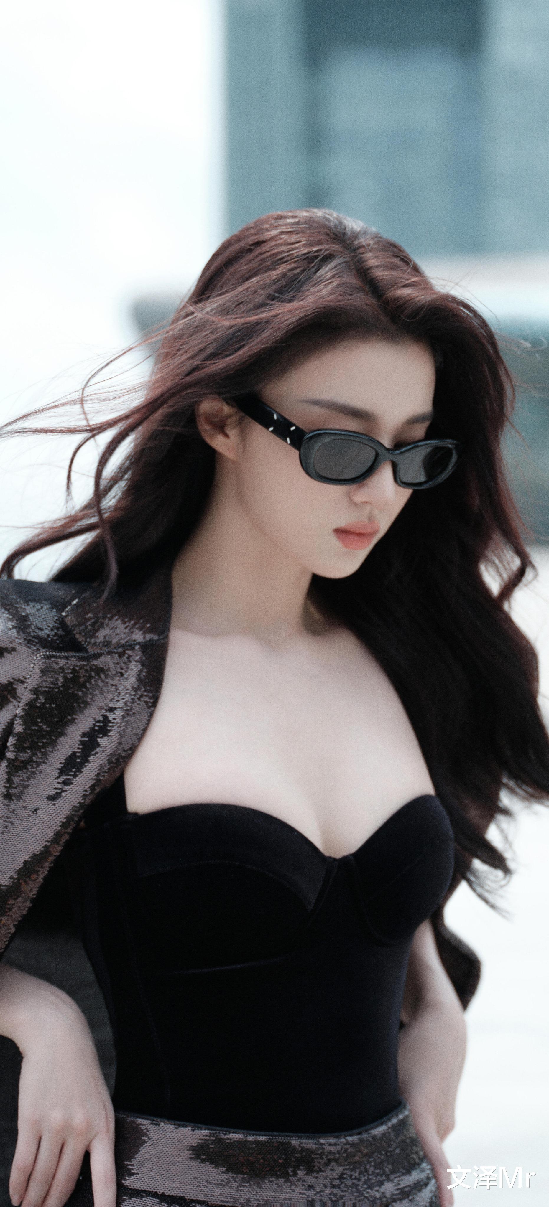 她身着黑色深V吊带倚靠石台,仰头时脖颈线条如天鹅般优雅。没有过多配饰点缀,仅靠细腻肌肤与亮片短裙的光泽交织,就营造出“less is more”的高级感。粉丝狂赞:“这组光影质感堪比电影镜头!”