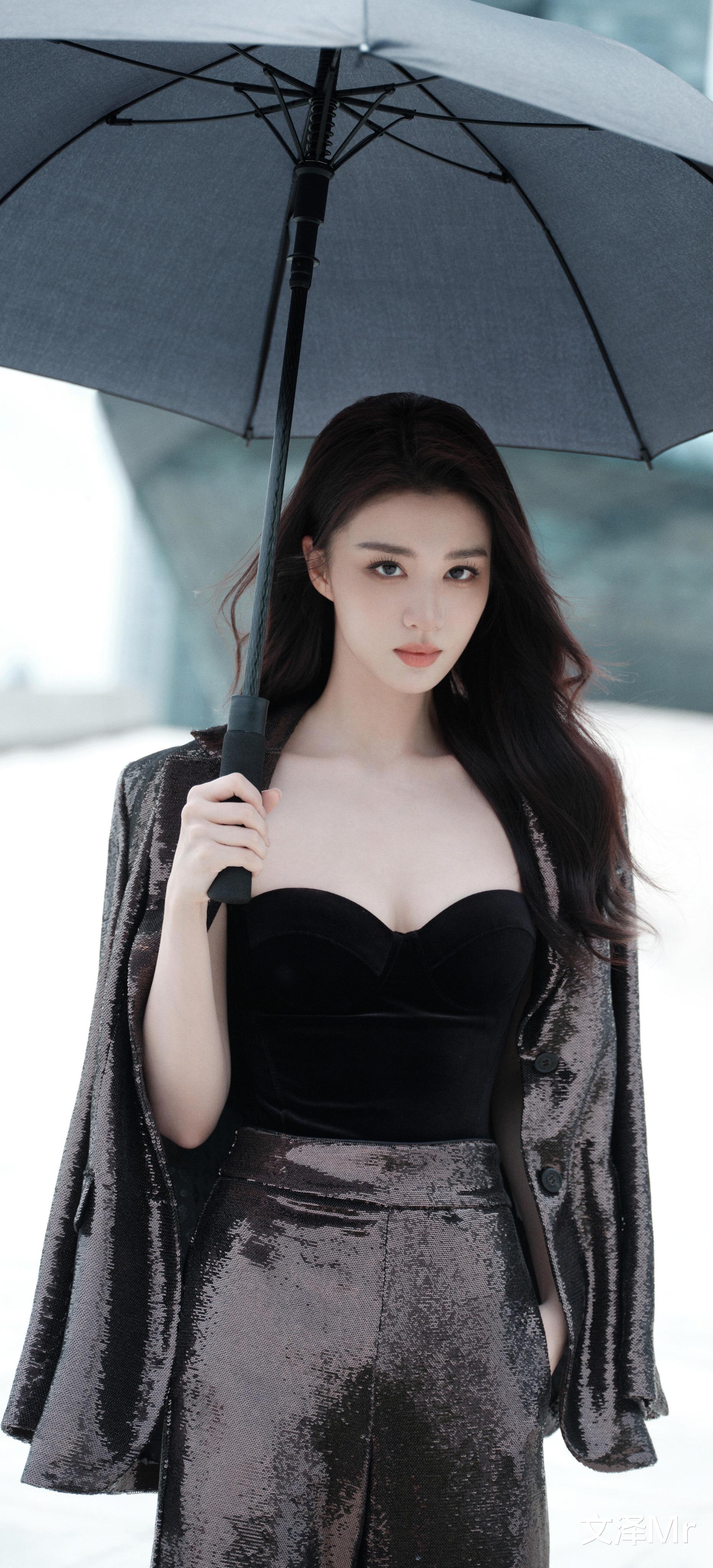 最绝的是图4的叙事感!王楚然手持雨伞立于灰调背景中,银黑撞色套装如泼墨山水画。裤腿的飘逸感与外套的挺括质地相映成趣,让人想起她在《听说你喜欢我》中饰演的医生宁至谦——理性克制下藏着温柔力量。
