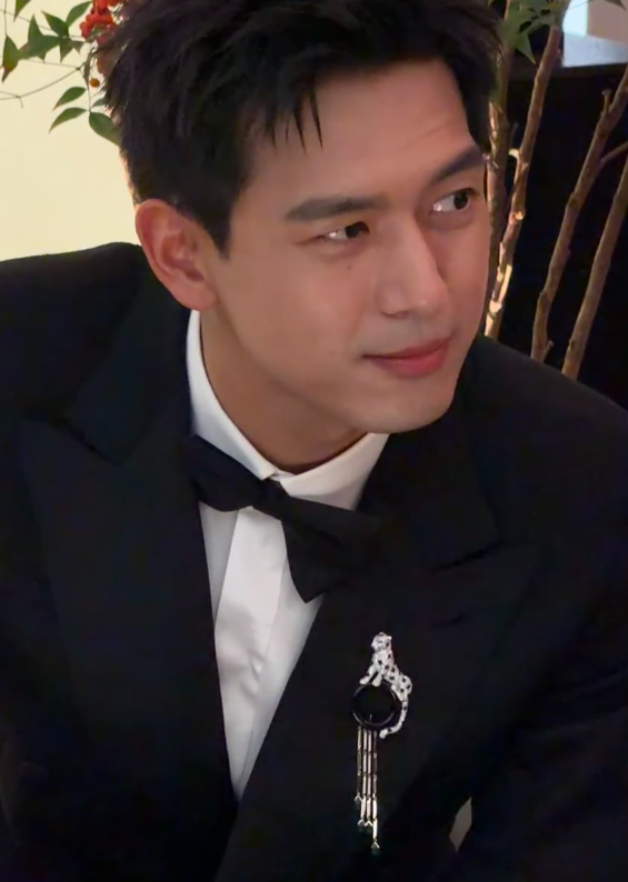 李现身穿黑色西装搭配白衬衫,充满自然力量的猎豹胸针颇具巧思。